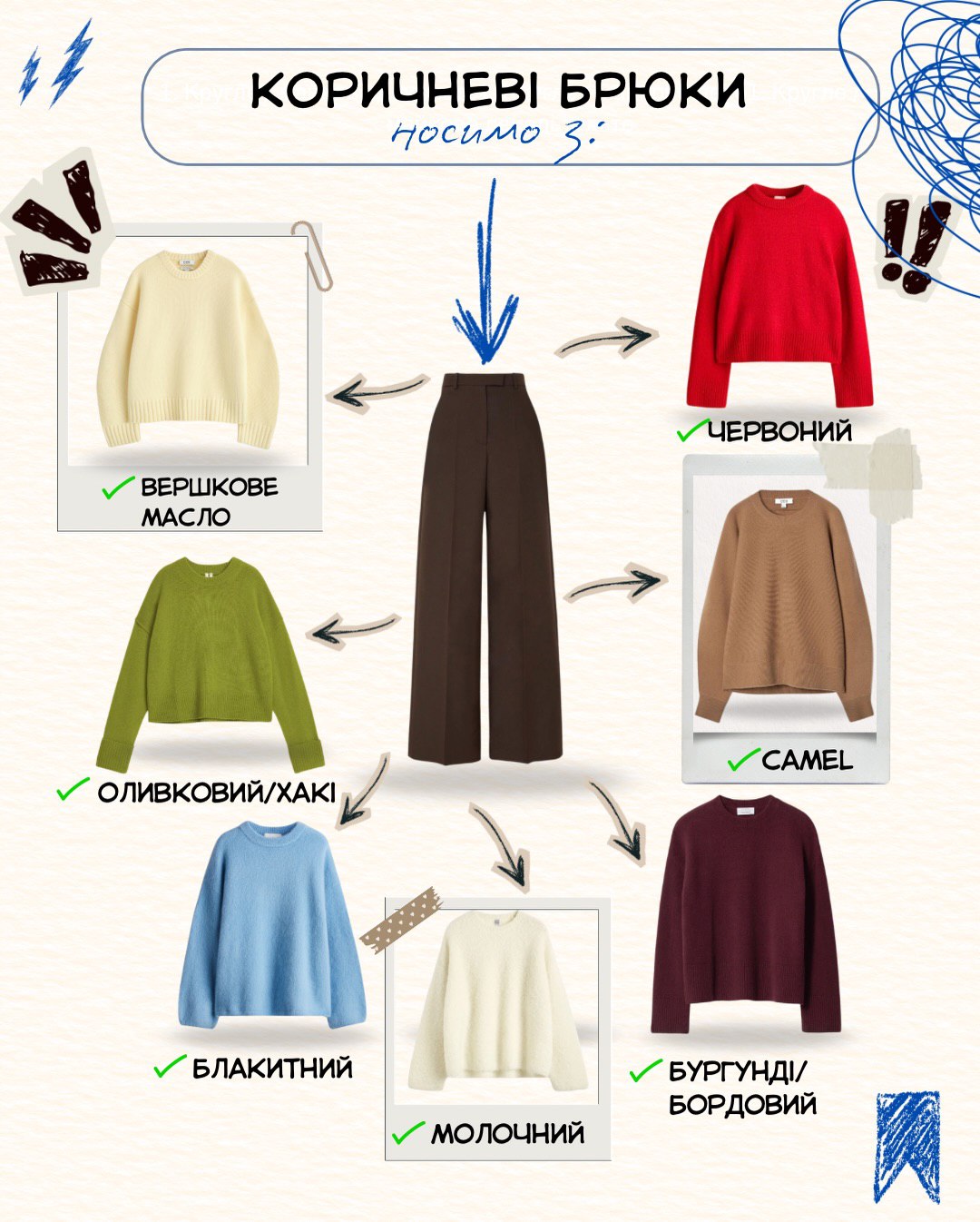 Коричневі штани – це база, яка може виглядати набагато цікавіше за стандартну чорну класику. Стилістка радить поєднувати їх із наступними відтінками.