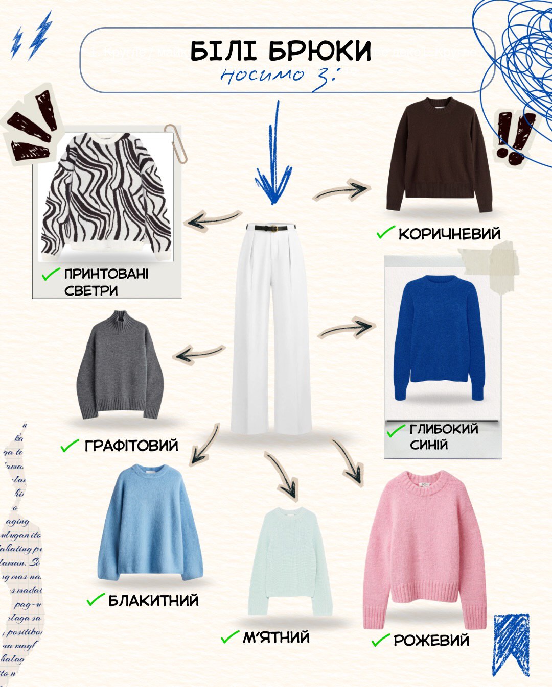 Білі штани підходять для офісного стилю, вечірніх виходів і легких повсякденних образів із яскравими аксесуарами.