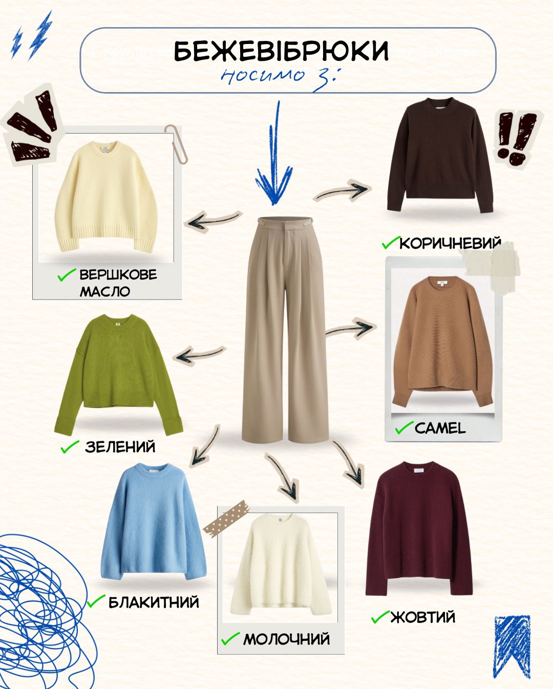 Бежеві штани легко поєднуються з різними текстурами та тканинами: трикотаж, сорочки з льону, легкі пальта.
