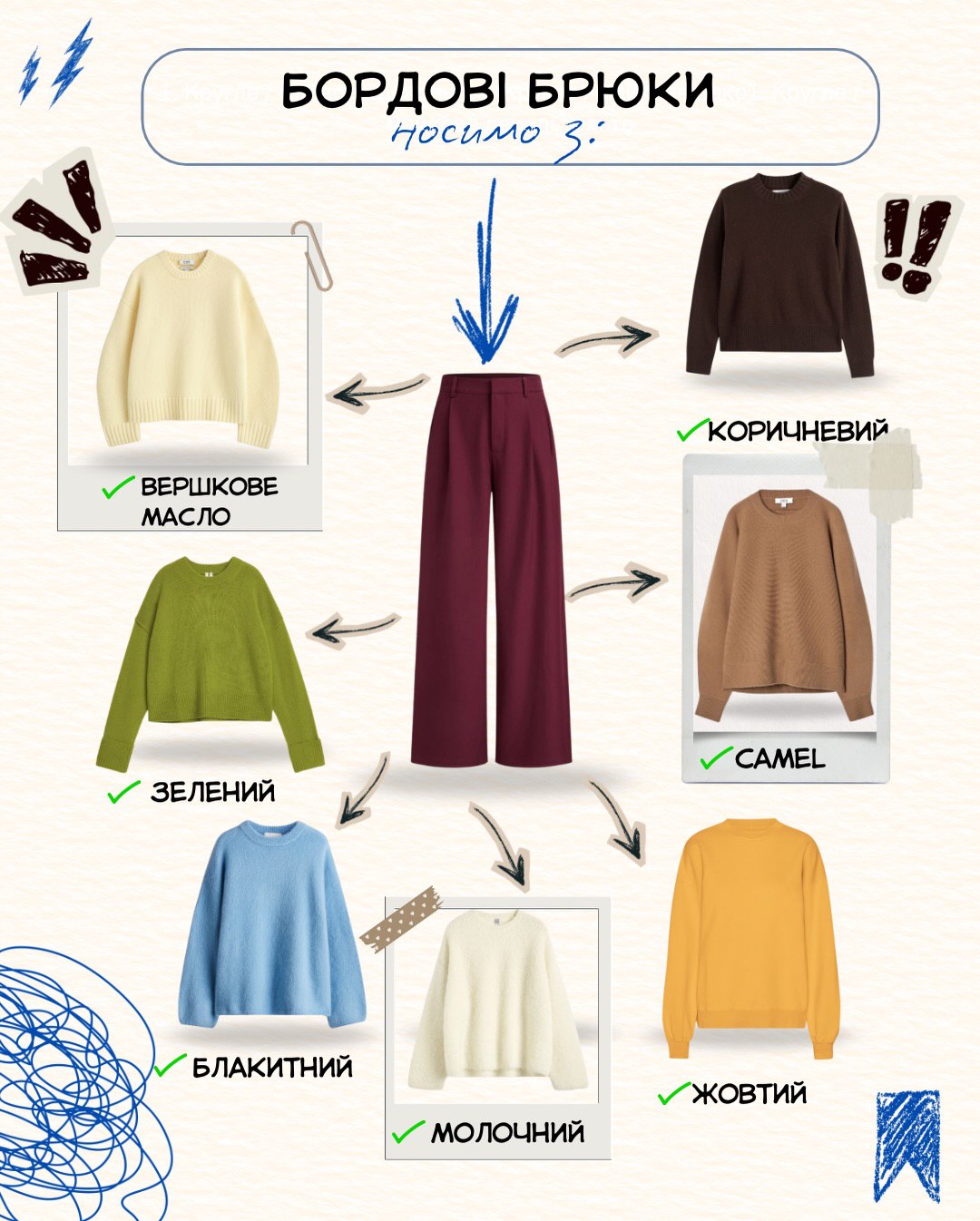 - Бургунді / бордовий: глибоке та насичене поєднання, ідеальне для осінньо-зимового гардероба.