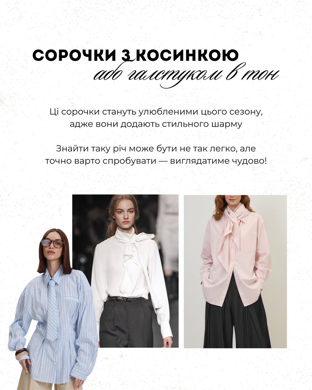 Сорочки з косинкою або галстуком у тон – ще один must-have сезону. Такі моделі додають образу інтелігентності та легкої театральності.