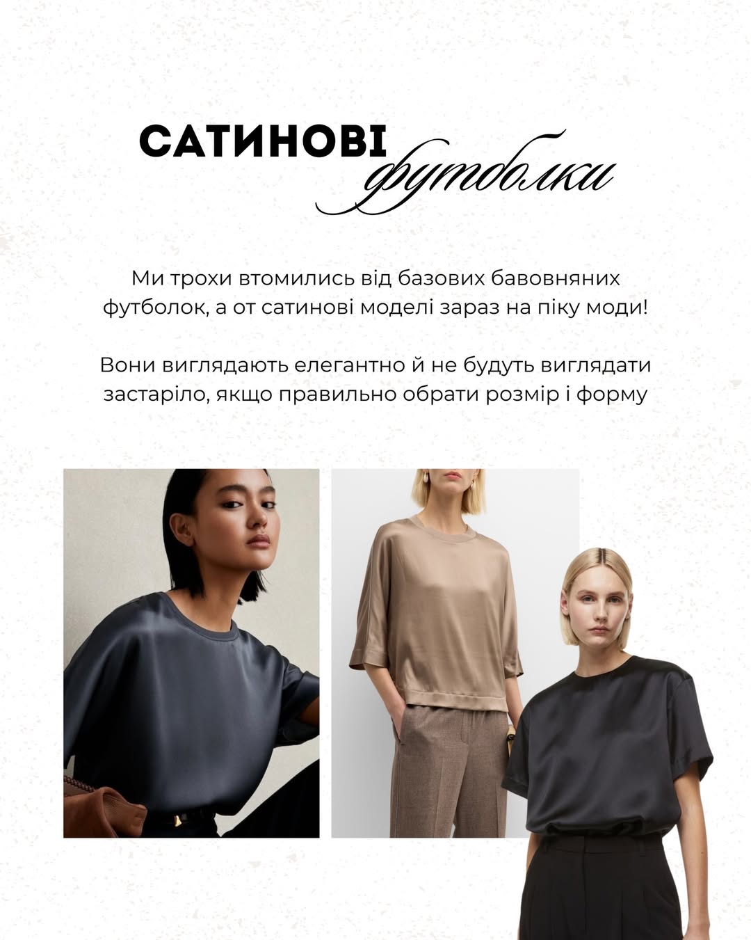 За словами дизайнера, ми поступово втомлюємося від класичних бавовняних футболок. Натомість сатинові моделі зараз перебувають на піку популярності.