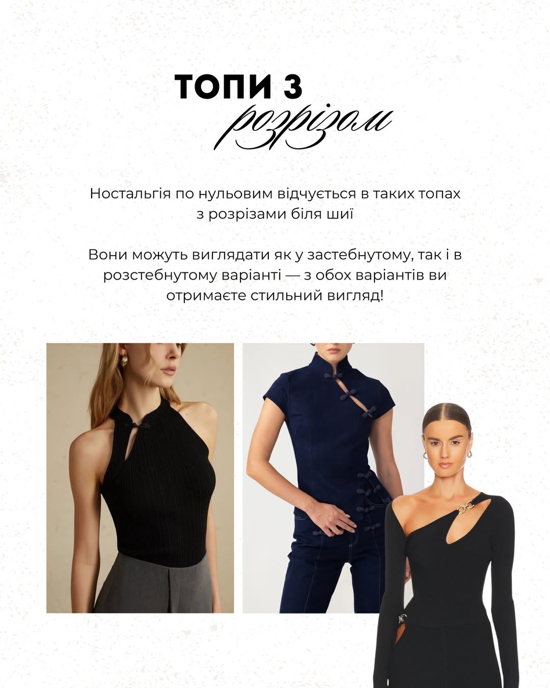 Ностальгія за 2000-ми продовжує впливати на тренди. Топи з розрізами біля шиї – яскраве тому підтвердження.