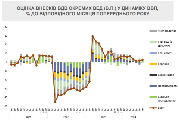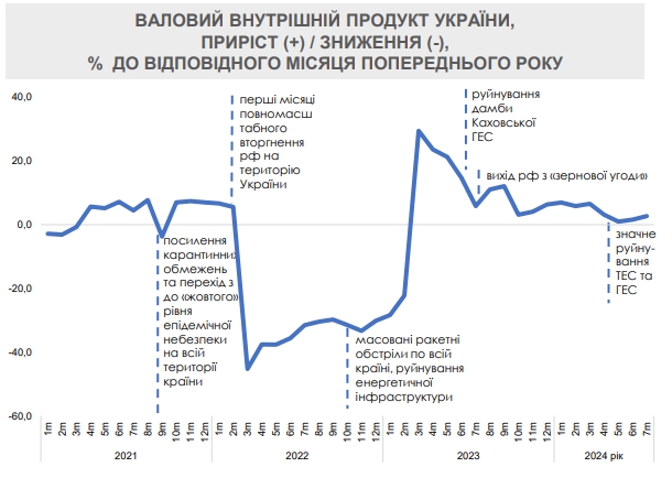 У липні 2024 року зростання валового внутрішнього продукту України прискорилося до 2,7% після 1,6% у червні. Це відбулося через ранній збір врожаю в сільському господарстві завдяки погоді.