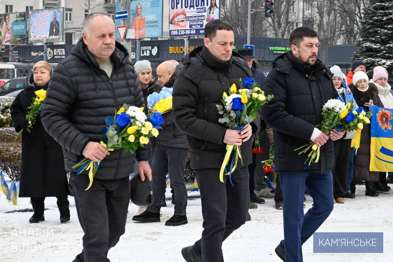На Майдані Героїв біля пам’ятного знаку загиблим міський голова Камʼянського разом із керівництвом Кам’янської районної військової адміністрації та районної ради, військовими, правоохоронцями, депутатами, ветеранами, родинами загиблих і громадськістю схилили голови у загальнонаціональній хвилині мовчання та поклали квіти на знак вдячності й шани.